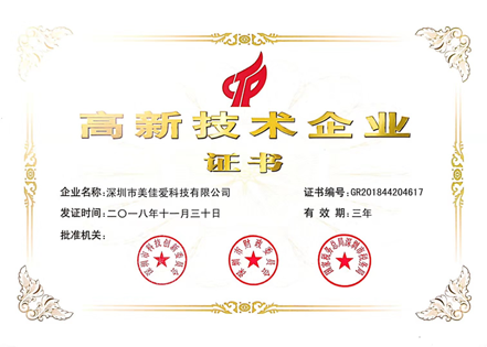 美佳愛(ài)科技高新技術(shù)企業(yè)認(rèn)證證書(shū)
