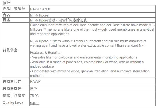 RAWP04700 MilliporeMF-Millipore濾膜,混合纖維素酯濾膜