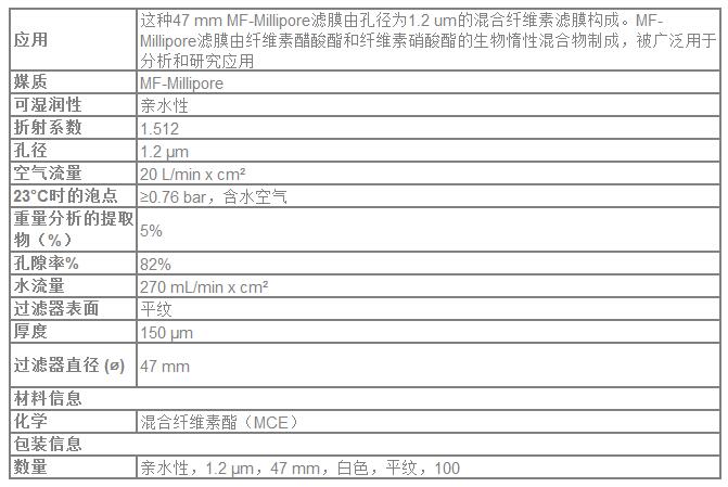 這種47 mm MF-Millipore濾膜由孔徑為1.2 um的混合纖維素濾膜構成。MF-Millipore濾膜由纖維素醋酸酯和纖維素硝酸酯的生物惰性混合物制成,被廣泛用于分析和研究應用。